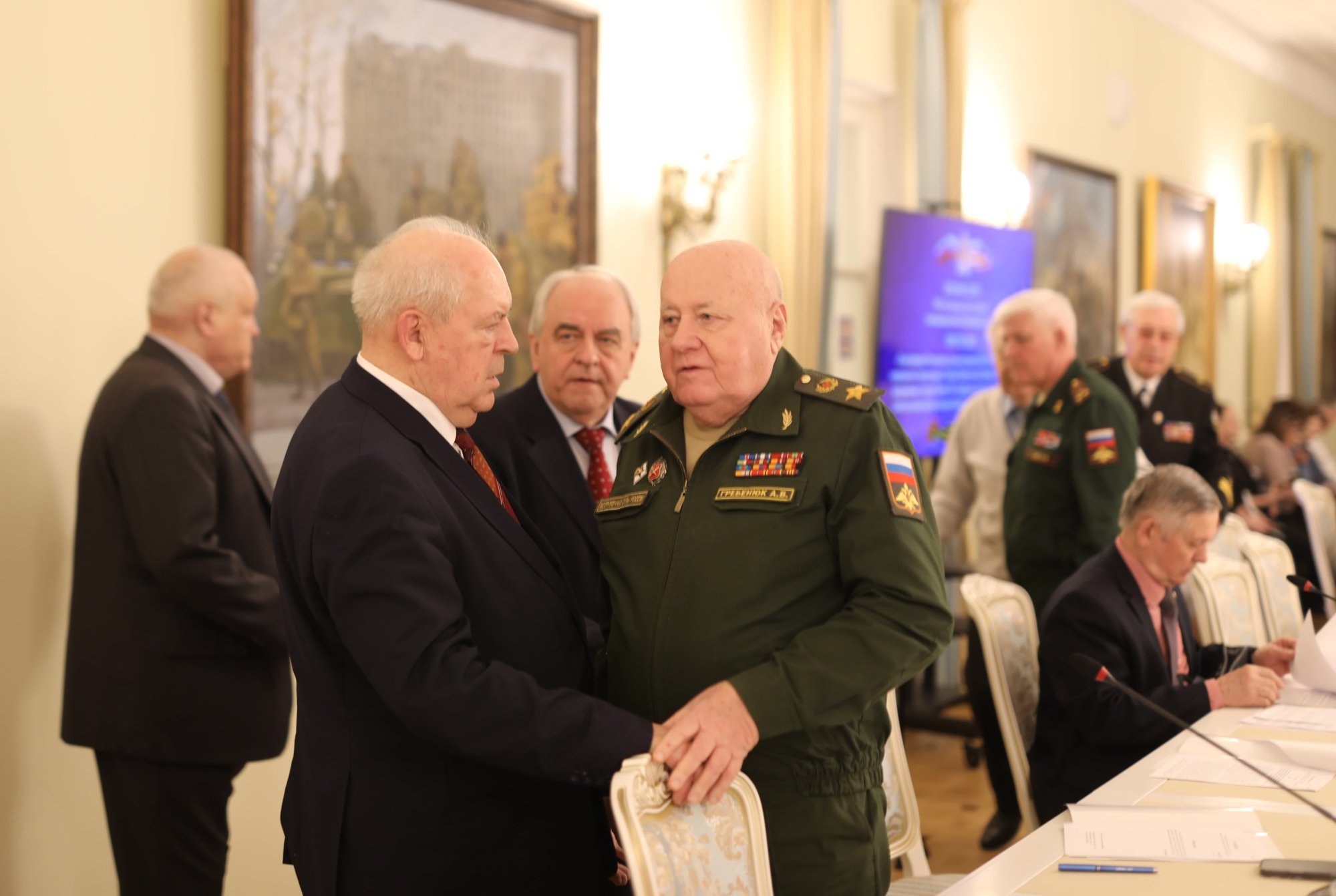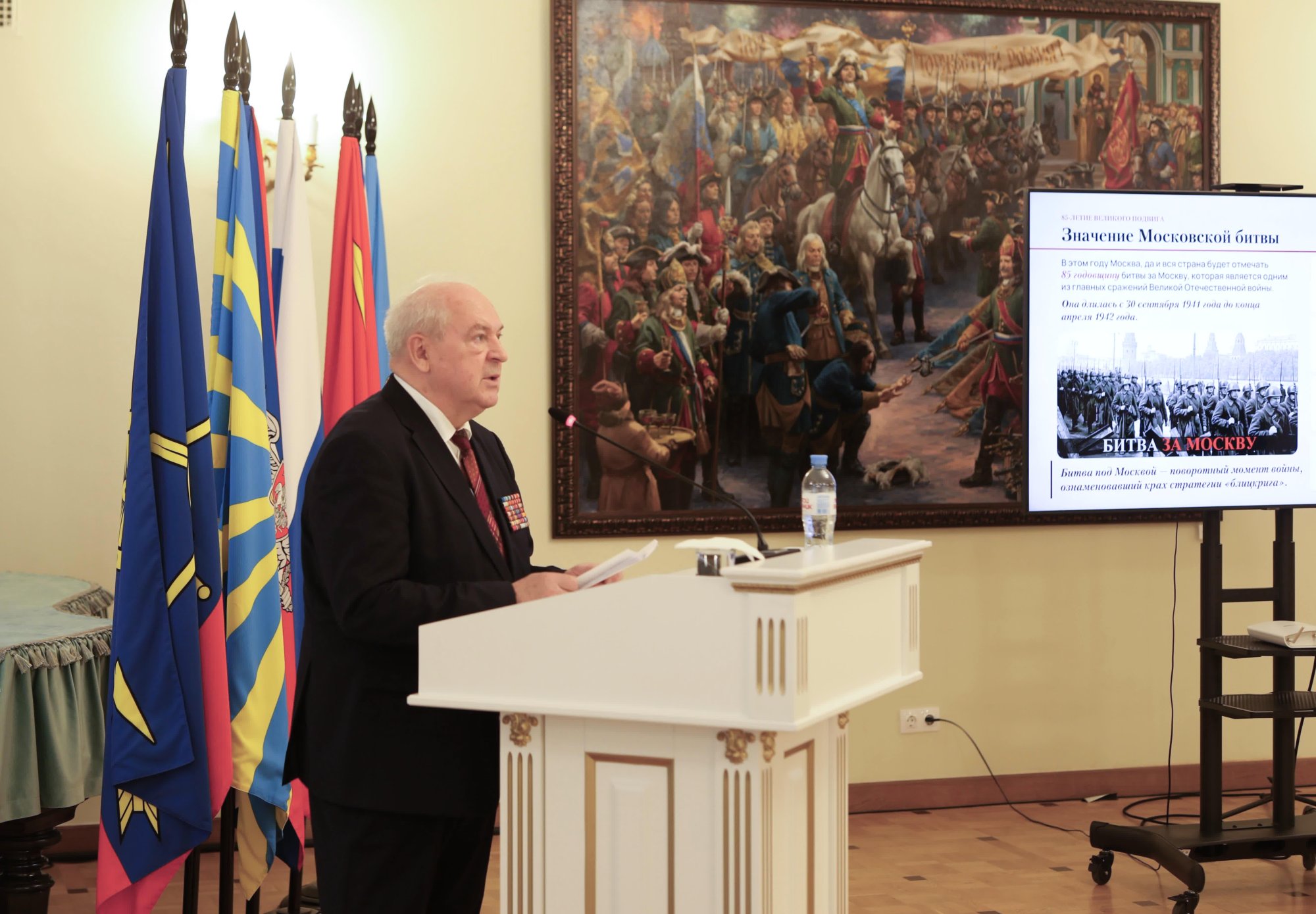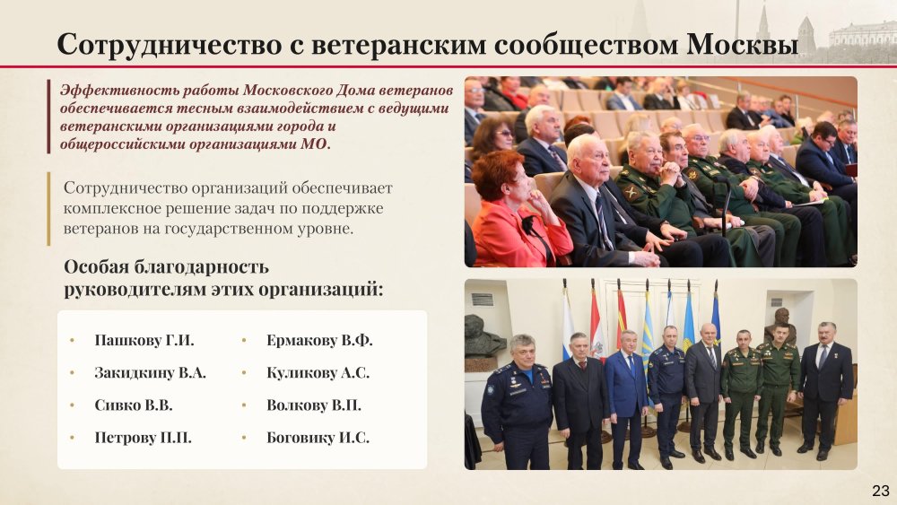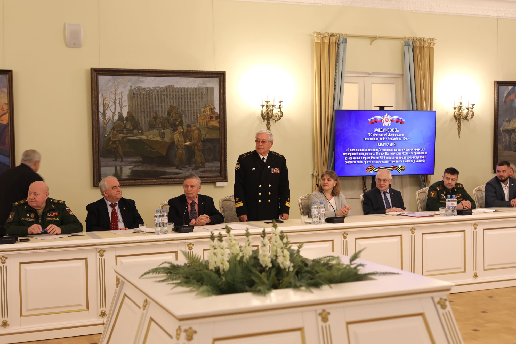 - генерал-полковник АКЧУРИН Р.С.- советник Председателя Московского городского Совета ветеранов; - ЗАКИДКИН В.А.– И.О. Председателя Московского Комитета ветеранов войны; - генерал армии ЕРМАКОВ В. Ф.-Председатель Совета Общероссийской общественной организации ветеранов Вооруженных Сил Российской Федерации; - генерал-полковник ВОЛКОВ В.П.-Председатель Координационного Совета Содружества общественных организаций ветеранов (пенсионеров) Независимых государств; - Герой России СИВКО В.В. - Первый заместитель Председателя Правления Клуба Героев Советского Союза, Героев Российской Федерации и полных кавалеров ордена Славы г. Москвы и Московской области. В докладе и выступлениях участников заседания отмечено , что высокая активность и ответственность в подготовке празднования 80-летия Победы советского народа в Великой Отечественной войне позволили сформировать в ветеранском сообществе столицы созидательную духовную атмосферу и готовность обеспечить всестороннее организационное и информационно-пропагандистское участие в практической реализации Плана Правительства Москвы, посвященного организации празднования в городе Москве 85-й годовщины начала контрнаступления советских войск против немецко-фашистских войск в битве под Москвой.