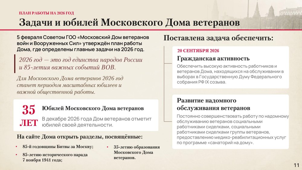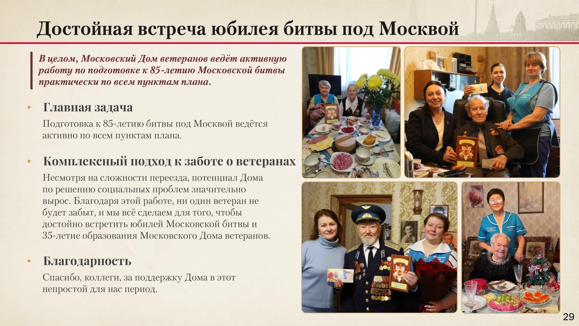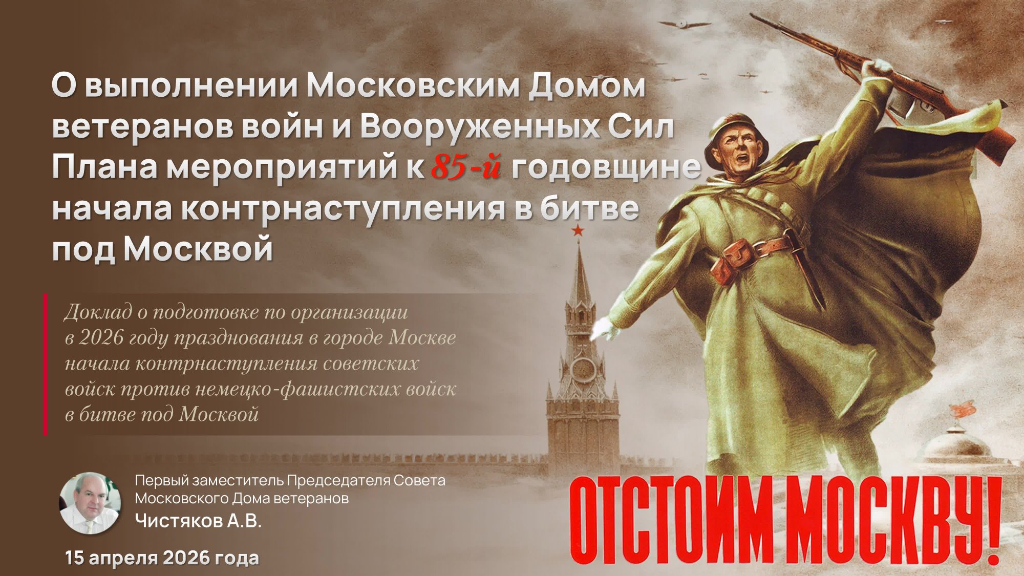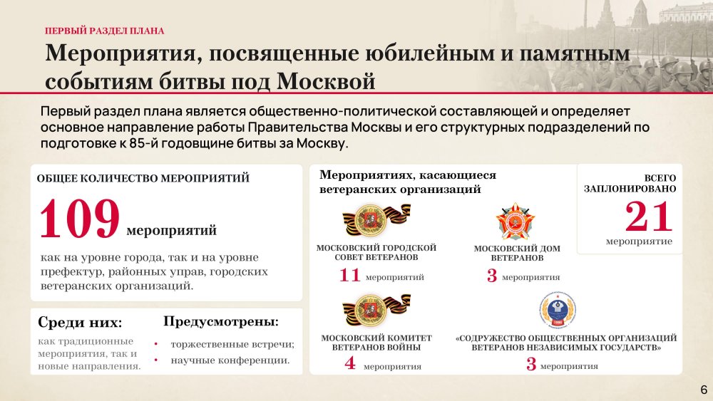 О выполнении Московским Домом ветеранов войн и Вооруженных Сил мероприятий, определенных Планом Правительства Москвы по организации празднования в городе Москве 85-й годовщины начала контрнаступления советских войск против немецко-фашистских войск в битве под Москвой