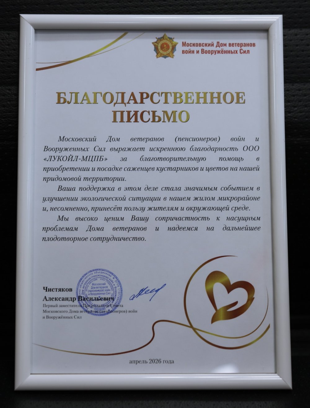 18 апреля в Москве прошёл общегородской субботник, но для сотрудников Московского Дома ветеранов и их верных помощников - волонтеров этот день стал особенным. Вместе с командой работников компании ООО «Лукойл-МЦБП» они не просто наводили порядок, а создавали новый сад на новой дислокации Дома ветеранов по адресу: улица Дурова, дом 3/13.Тёплая атмосфера единения царила на территории с самого утра. Вооружившись граблями, метлами и садовым инвентарём, участники субботника убрали прошлогоднюю листву, подготовили почву для посадок и наполнили воздух ароматами приближающегося лета. Результат превзошёл все ожидания: теперь общественное пространство украшают 35 молодых саженцев, 5 стройных туй, 10 нежных гортензий, 5 королевских роз и 15 кустов пышной сирени.«Субботник стал для нас не просто вкладом в благоустройство, а настоящим праздником единства, уважения к природе и нашему общему дому, имя которому — Москва. Дарить городу свежесть и ухоженность, ощущать радость полезного труда — это бесценно», — делятся впечатлениями сотрудники Дома ветеранов.Завершился «зелёный десант» трогательным моментом благодарности. Первый заместитель Председателя Совета Александр Чистяков вручил волонтёрам компании «Лукойл» БЛАГОДАРСТВЕННОЕ ПИСЬМО и сладкие подарки для детей, участвующих в акции. Руководство Московского Дома ветеранов (пенсионеров) войн и Вооруженных Сил выразило компании «ЛУКОЙЛ-МЦПБ» особую признательность: «Ваша поддержка стала значимым событием в улучшении экологической ситуации в нашем жилом микрорайоне. Это несомненно принесёт пользу всем жителям и окружающей среде. Мы высоко ценим Вашу сопричастность к насущным проблемам Дома ветеранов и надеемся на дальнейшее плодотворное сотрудничество».
